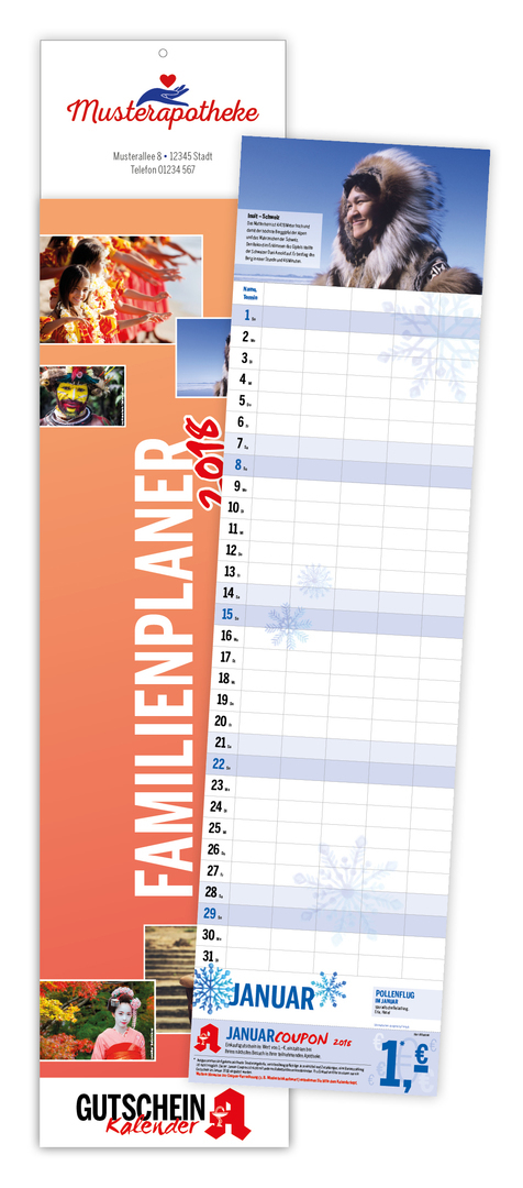 Jedes der 12 Monatsblätter beeinhaltet einen perforierten Gutscheincoupon zum Abtrennen im Wert von 1,- €,. Dieser außergewöhnliche Kalender erreicht damit eine Rücklaufquote von bis zu 35%.